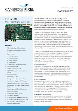 The single-lane (x1) PCI express card generates radar signals under the control of host application software. Time-stamped radar video data is passed to the card over the PCI express bus and the card generates the appropriate video, trigger and azimuth data signals in real-time. A first-in-first-out (FIFO) buffer on the card allows the host computer to write a number of radar returns into memory, which the HPx-310 card then outputs at the requested times.