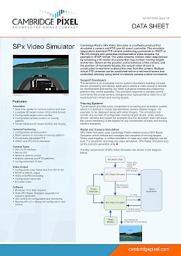 Security and surveillance camera simulator to help develop software, test systems & train operators. Includes supports for PTZ (pan tilt zoom) controllers, 3D scenes and models, moving platforms and more. The software can be paired with SPx Radar Simulator, allowing 3D models to follow imported radar tracks, ideal for building realistic scenarios.